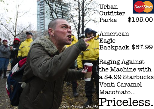 Recently, he posted a photo of an Occupy Wall Street protester. He took a careful look at what the guy was wearing . . . and holding.